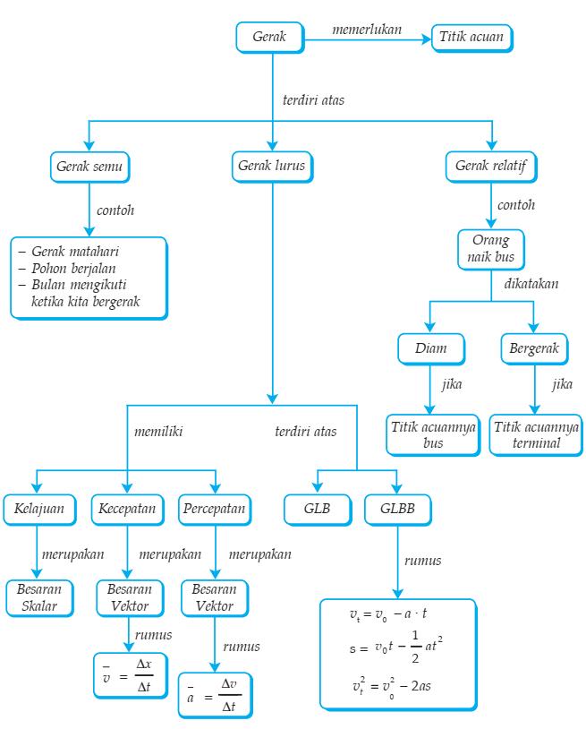 Pada bab ini kita akan mempelajari tentang kinematika. Kinematika merupakan ilmu yang mempelajari tentang gerak tanpa memperhatikan penyebab timbulnya gerak. Sedangkan ilmu yang mempelajari gerak suatu benda dengan memperhatikan penyebabnya disebut dinamika. Dinamika akan kita pelajari pada saat kalian mempelajari hukum-hukum Newton. Berikut peta konsep gerak lurus yang akan kita pelajari: